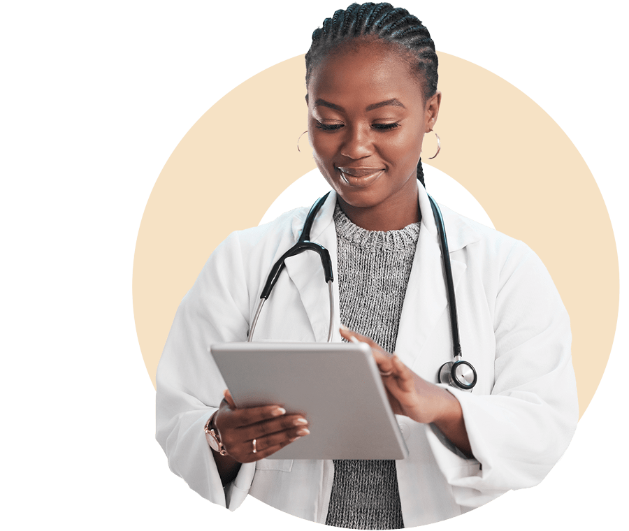 Female medical professional smiling while looking at tablet