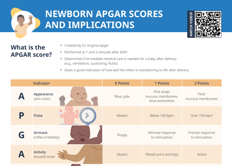 The APGAR score is a quick assessment of a newborn’s health that is performed at 1 and 5 minutes after birth. Healthcare providers can use the APGAR score to quickly assess a newborn’s health and determine if immediate medical care is needed. The score can also give a good indication of how well the infant is transitioning to life after delivery.