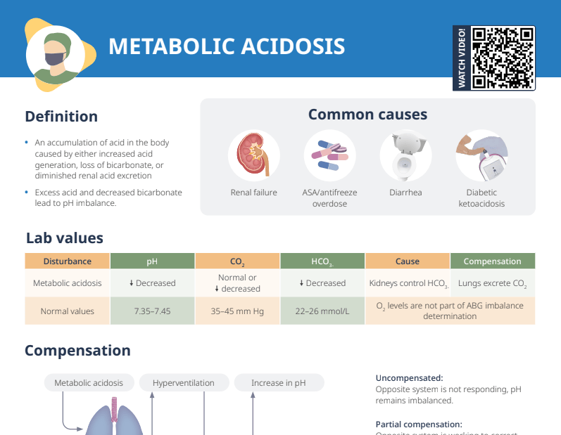 Metabolic acidosis is an accumulation of acid in the body caused by either increased acid generation, loss of bicarbonate, or diminished renal acid excretion. Excess acid and decreased bicarbonate lead to pH imbalance.